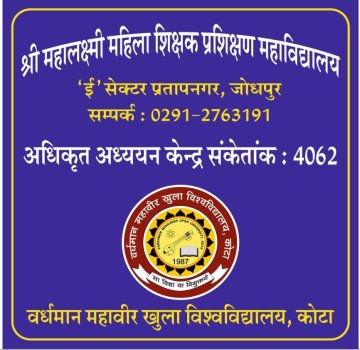 SHRI MAHALAXMI MAHILA TEACHERS TRAINING COLLEGE (4062 ) E- SECTOR, PRATAP NAGAR, JODHPUR JODHPUR - 342001 9352620050 Programmes Available S.NO. PROG CODE PROGRAMME 1 BED-I Bachelor of Education Year I Counsellor @ Study Center (All regular teachers of the Government Colleges are ifso-facto counsellor of Vardhman Mahaveer Open University in the relevant programme. The list of faculty members of non Government Colleges (Affiliated Colleges) (if any) is mentioned below) S.NO. Code Name Specialization 1 66248 DR. SANDHYA SHUKLA PH.D.